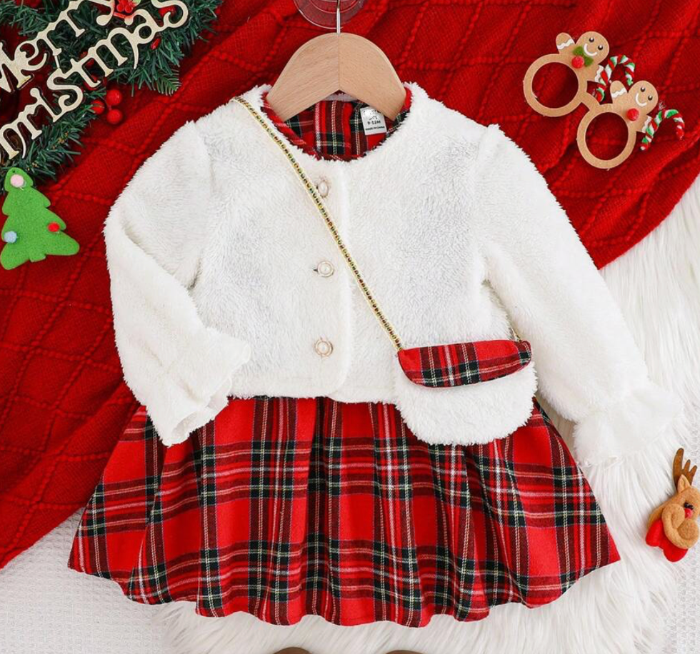 Vestido de cuadros y suéter con cartera